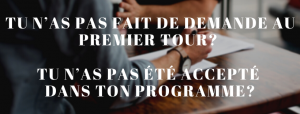 Tu n’as pas fait de demande au premier tour ou encore, tu n’as pas été accepté dans ton programme? Tu dois d’abord aller consulter le tableau des places disponibles, affiché à partir du 26 mars. Ensuite, tu dois aller modifier ton choix de programme sur le site du SRAM. Aucuns frais supplémentaires ou de reconstitution de dossier ne seront à assumer si tu avais fait une demande au 1er tour. La date limite d’inscription est le 22 avril 2020 et tu auras la réponse affichée sur le site du SRAM le 12 mai 2020.