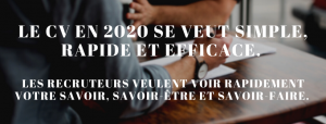Le CV en 2020 se veut simple, rapide et efficace. Les recruteurs veulent voir rapidement ton savoir, savoir-être et savoir-faire. Essaie d’être accrocheur au niveau de l’en-tête de ton CV. Accroche l’œil des recruteurs, sans y inclure des dessins ou des designs qui s’avèrent non pertinents et qui pourraient déconcentrer l’employeur lisant ton CV. Garde une structure traditionnelle en gardant les points importants de tes expériences d’emploi.