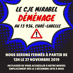 À compter du 2 décembre 2019, les activités du CJE Mirabel seront regroupées temporairement dans les espaces du Centre d’hébergement multiservices de Mirabel situé au 13 936, boul. Curé-Labelle, Mirabel (Québec) J7J 1L3.